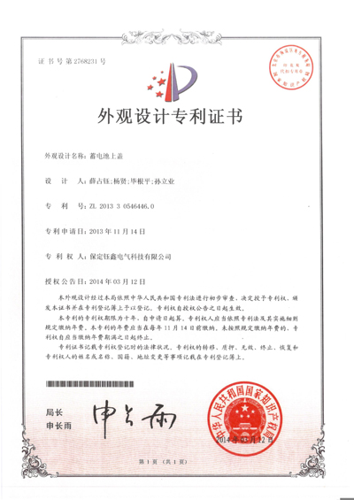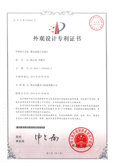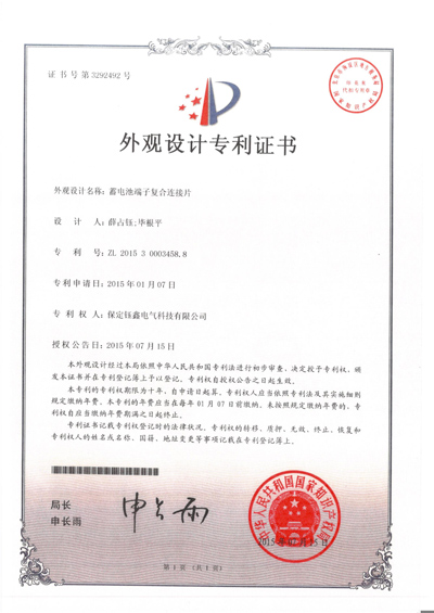 蓄電池端子連接片套件外觀設(shè)計(jì)專利證書 頭條